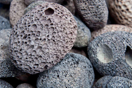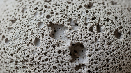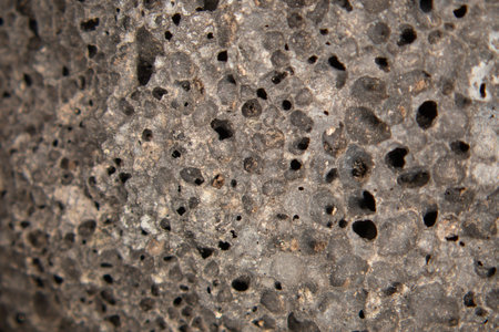 Extreme close-up of a grey, porous volcanic rock surface with many small holes. Clear details and vibrant colo...
