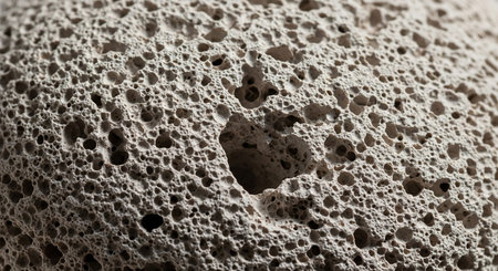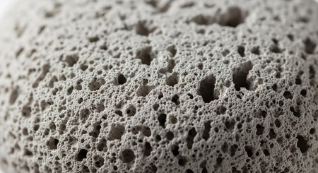 Extreme close-up of a grey pumice stone revealing its intricate porous texture and numerous small holes.