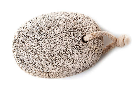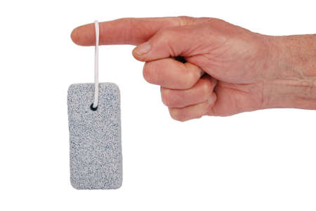 Old hand hold grey pumice stone with rope on white background with soft shadow. Clipping path