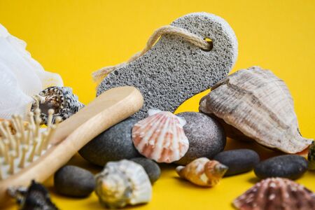 Various spa items, Skincare aromatherapy objects, Spa eco friendly set kit for face and body treatments care, Natural materials in bathroom. Wooden hair brush. Eco-friendly care products. Natural beauty