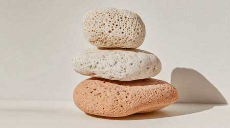 This image features three uniquely textured natural rocks stacked harmoniously. The minimalist setting highlights their earthy tones and shapes, perfect for design inspiration.