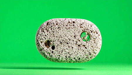 A single, porous pumice stone floats against a vibrant green backdrop, a minimalist symbol of natural exfoliation and self-care.