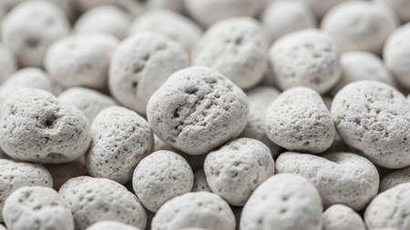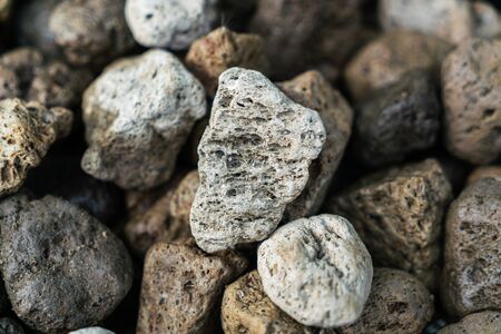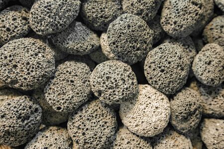 Textures showing pile of small, porous white volcanic pumice stones with textured surfaces keywords: pumice, stones,...