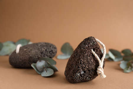 Pumice Stone on Brown Bacground, Gray Porous Lava Piece, Volcano Stone for Foot Care, Basalt Extrusive Igneous Rock, Foot Wellness Pumice Stone on Color Backdrop, Spa Concept