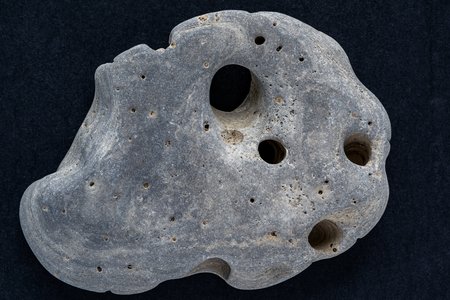 Close up view of a porous grey rock with numerous holes and cracks. The intricate surface shows a unique natural texture.