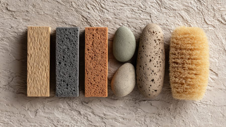 A captivating arrangement of various cleaning sponges and stones showcases natural textures and earthy tones, perfect for design inspiration and home decor.