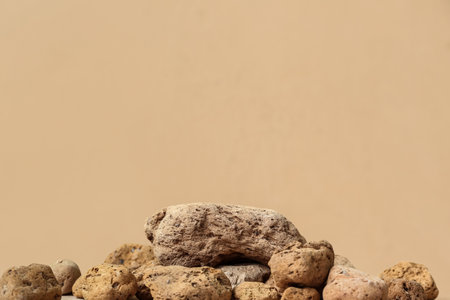 Pumice stone close up and copy space. Pumice stone 3d on a pink background and dry plants. Beauty concept. Background for cosmetic product branding, identity and packaging inspiration. Podium with pin