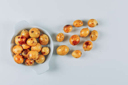 Loquats in a plate and on a white background. top view.
