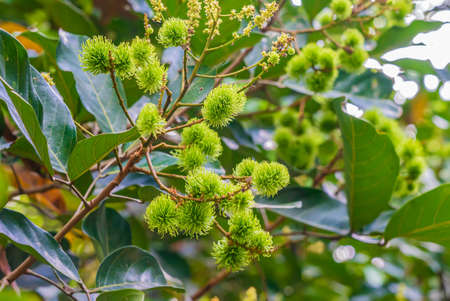 Rambutan in green on a tree. Rambutan is a tropical fruit, sweet taste.