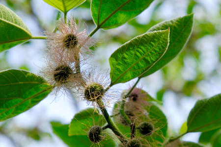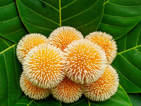 A leichhardt pine or Kadam flower with green leaves close up on the tree