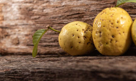 fresh sapodilla fruits on old wooden background. tropical fruits concept