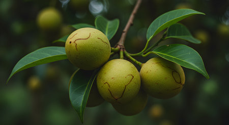 Nutmeg or muscat nuts growth on the tree under a sunny day