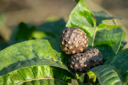 Two dark irregularly shaped galls, possibly oak apples, with rough, warty surfaces, rest on a vibrant green leaf. These dark brown black objects show indentations and protrusions