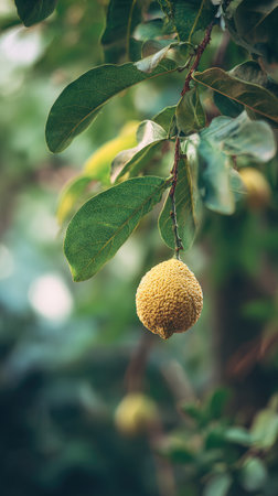 A detailed photograph of a single Ugli fruit, swaying gently in the wind, captured in natural daylight. Fresh and airy atmosphere, soft motion blur on leaves, crisp details on textures, background softly blurred into natural greenery, cinematic natural light, realistic photography.
