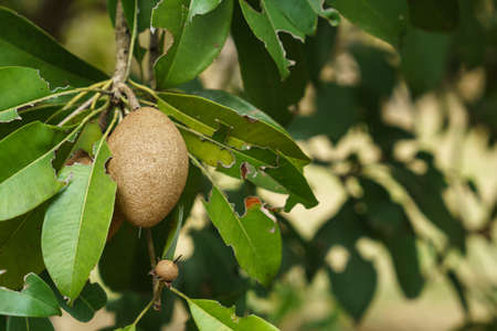 Manilkara zapota fruit growing on the tree close up view