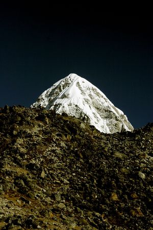 Pumori summit from Hala Patthar acclimatization viewpoint .Pumori mountain on the Nepal-China border in the Mahalangur section of the Himalayas. Eight km east of Mount Everest