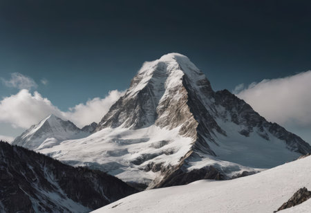 A stunning view of a towering snow-capped mountain peak rising majestically into a clear blue sky, surrounded by soft white clouds.