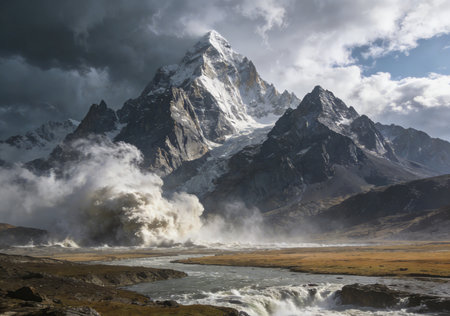 the photo captures a stunning mountain landscape with clouds and snow, reminiscent of himalayan art. the backlit photography creates a mysterious backdrop, highlighting the photo-realistic details of the scene. shot with a canon eos 5d mark iv, the image showcases a mix of dark, white, and amber tones, evoking a sense of mysticism and enchantment. ai generated