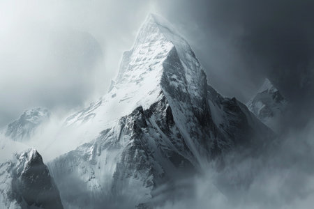 Experience the breathtaking beauty of a majestic snow-capped mountain peak blanketed in fog under a serene blue sky, showcasing nature's grandeur and tranquility.