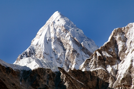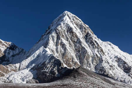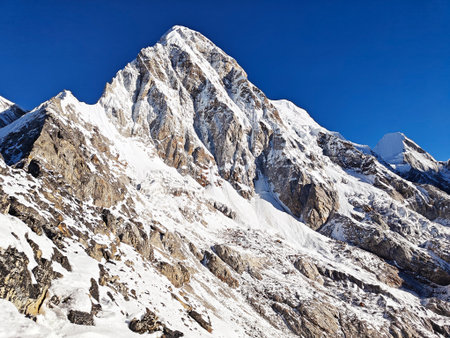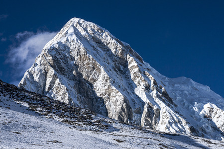 Pumori mountain summit on the famous Everest Base Camp trek in Himalayas, Nepal. Snowy mountain summit on a bright sunny day with clear sky. Beautiful mountain summit landscape in Himalayas.