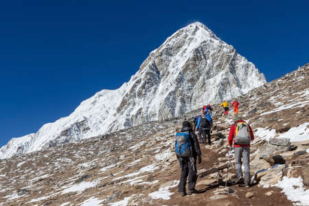 Group of trekkers coming up to Kala Patthar - the Everest mount view point - with Pumori peak on the background. Attractive photo.