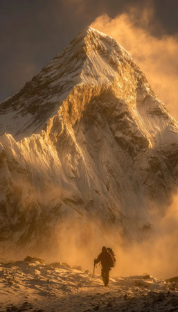 A solitary figure ascends a towering snow-covered mountain peak, backlit by a vibrant, golden sky. The image features a strong vertical composition, with textured snow and rocky terrain in the foreground. It evokes feelings of adventure and accomplishment, and is suitable for commercial and editorial use.