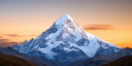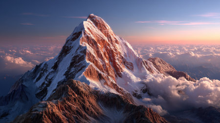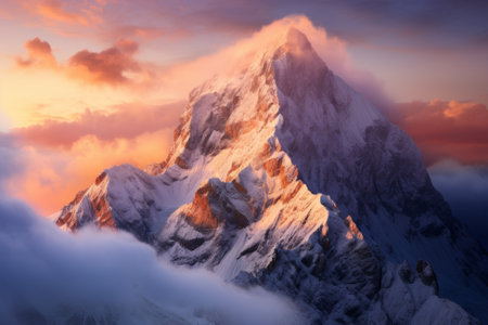 Stunning view of a towering mountain peak adorned with snow, surrounded by soft clouds at sunset, showcasing the beauty of nature and tranquility.