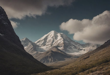 The image showcases a stunning mountain landscape dominated by towering, snow-capped peaks. The composition reveals a rugged terrain with a focus on the textured foreground. The cool color palette, accentuated by the vibrant hues in the sky, suggests an atmospheric daytime setting. This imagery can be employed for various commercial or editorial applications.