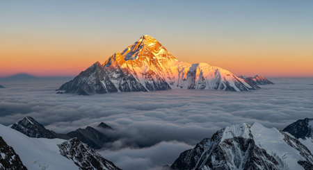 A majestic mountain peak is visible, partially covered in snow and lit by the soft glow of a sunrise. The image showcases a landscape with a layer of clouds, emphasizing the height and scale of the mountain. Suitable for travel, nature, or environmental related projects and editorials.