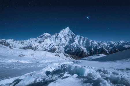 View of Mount Everest at night with starry sky and moon.Generative AI