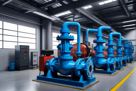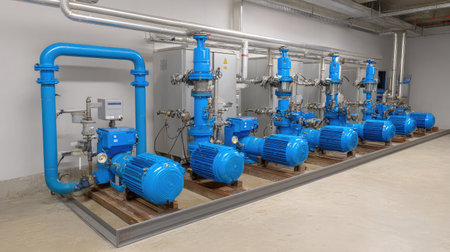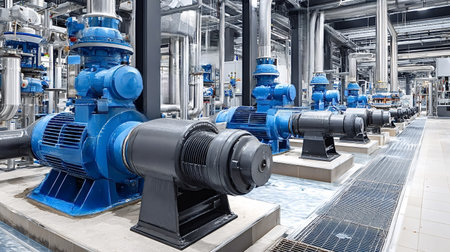 Industrial facility featuring a row of powerful blue centrifugal pumps, motors, and complex piping systems, demonstrating modern water processing and circulation technology