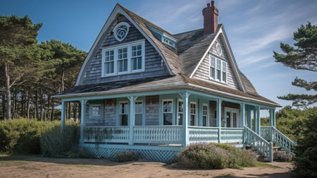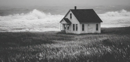 A grayscale image features a house standing in a field of tall grass with ocean waves in the background. The scene is illuminated by natural lighting, the composition gives a sense of isolation or tranquility. This image can be suitable for various commercial or editorial applications.