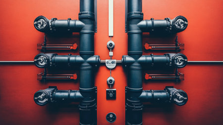 A visually striking arrangement of black pipes and valves against a vibrant red wall, showcasing industrial design elements suitable for engineering and construction projects.