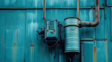 This image showcases industrial equipment mounted on a blue metal wall, featuring pipes and a turbine. The scene highlights signs of wear and rust, emphasizing an urban environment and the beauty of decay in machinery.