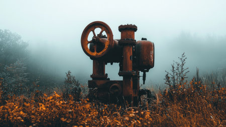 A rusty vintage pump stands alone in a foggy field, surrounded by dry grass and wildflowers. The scene evokes mystery and nostalgia, perfect for artistic projects.