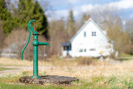 Old manual water pump. Vintage cast iron water pump with handle for pumping.
