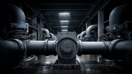 A large industrial pipe system in a dimly lit underground facility with multiple valves and connections