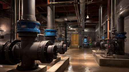 Water treatment plant water pump system. Valve and pumps in an industrial room.