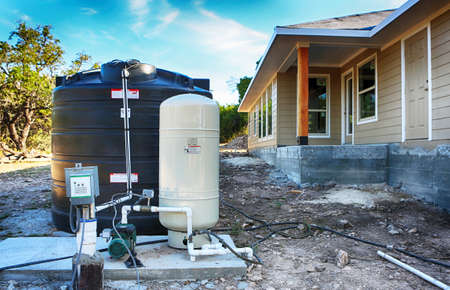 Deep water well set up in front of home construction. Drilled draw well with pressure switch and storage tank.