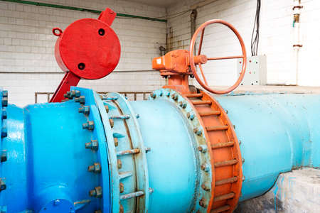 Closing valve on water pump station is pipeline with tanks in an technical room for supply of high-pressure aqua. Water sprinkler pipes and pressure control industrial system. Copy text space