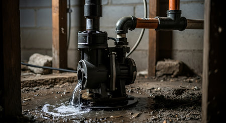 The a black water pump situated in a dirty and dimly lit basement. The pump is actively leaking water, creating a small puddle on the concrete floor beneath it. Copper pipes are connected to the pump, indicating its role in the plumbing system. The surrounding area is cluttered with debris and dirt, suggesting an industrial or utility setting. The overall scene conveys a sense of maintenance or repair work in an underground or basement environment.