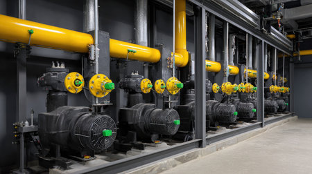 An intricate industrial pump system showcasing yellow pipes and black electric motors within a modern facility. Ideal for engineering and technology projects.