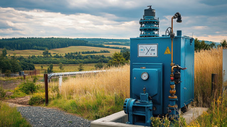 Blue gas distribution station operating in rural landscape delivering natural gas through pipeline system to consumers