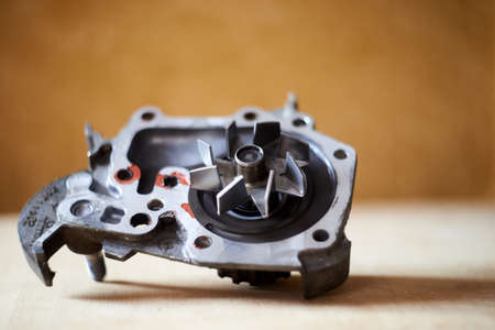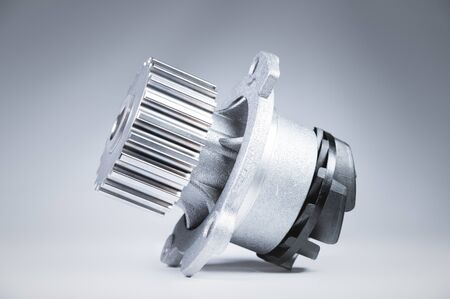 Close-up car engine cooling water pump on gray background