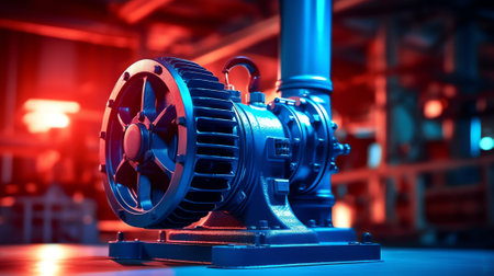 This retro-inspired image showcases a vintage industrial pump featuring red and blue components. It highlights intricate gears and pipes, embodying mechanical craftsmanship.