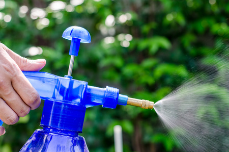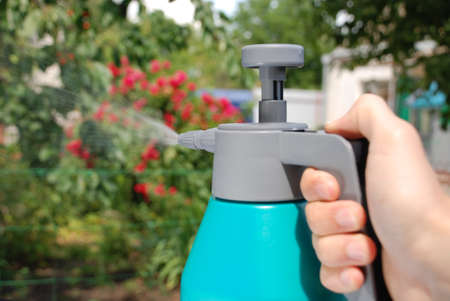 Hand holding watering can and sprayign to young plant in garden. Manual sprayer hand pressure pump. Sprayer adjustable nozzle for garden and auto. Sprayer gardening watering pesticide accessories