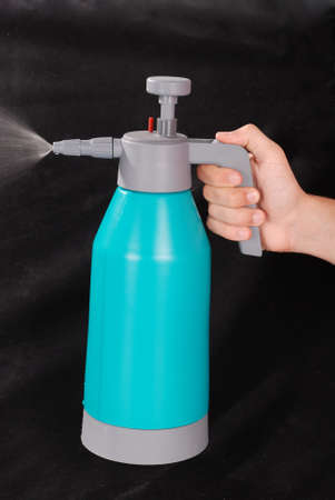 water sprayer bottle in a hand in a protective glove spraying liquid on a dark background. household items for home