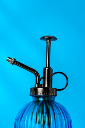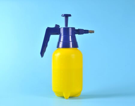 Spray bottle on blue background. Portable pressure water sprayer pump. Sprayer bottle.