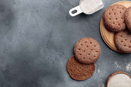 Stack of whole grain crispbread. Healthy snack food options, rich in fiber, on a rustic dark wooden background