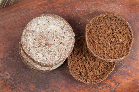 Rye and wheat bread gorbushki (top crusts) on a woodem board